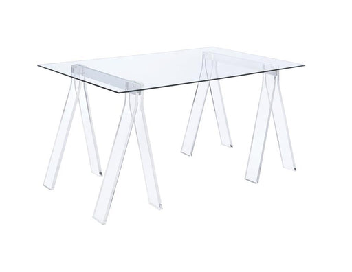 Enjoy an airy workspace with this 59-inch writing desk, pairing a sleek acrylic sawhorse base and a clear tempered glass top. Heavy gauge steel sup...